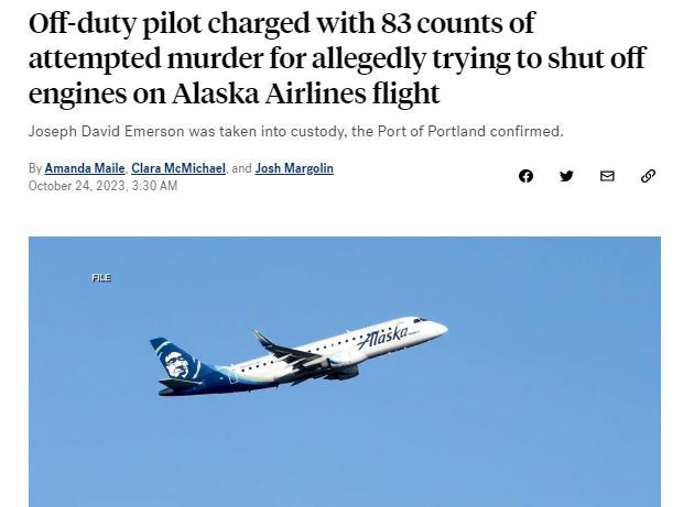 中新網(wǎng)10月24日電 綜合美媒24日?qǐng)?bào)道,美國官員透露,近日,美國阿拉斯加航空一趟航班遭遇了一起驚險(xiǎn)事件,一名未當(dāng)班的飛行員試圖在飛行途中關(guān)閉發(fā)動(dòng)機(jī)。目前,這名飛行員已被控83項(xiàng)謀殺未遂罪名。