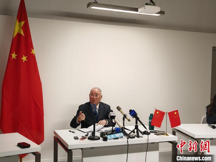 12月9日,阿聯(lián)酋迪拜,中國氣候變化事務(wù)特使解振華在新聞發(fā)布會(huì)上回應(yīng)中外媒體的提問。 中新社記者 龐無忌 攝
