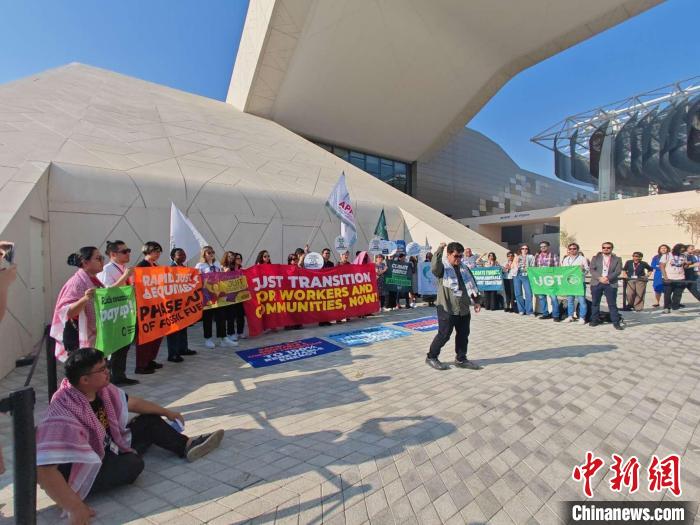 12月9日,阿聯(lián)酋迪拜,抗議者在聯(lián)合國氣候變化迪拜大會(huì)藍(lán)區(qū)會(huì)場集會(huì)并呼吁公正轉(zhuǎn)型?!≈行律缬浾?龐無忌 攝