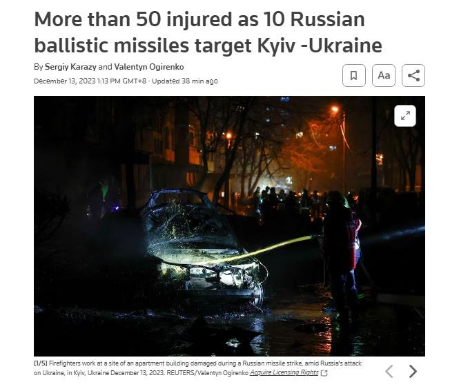 中新網(wǎng)12月13日電 據(jù)路透社報道,當(dāng)?shù)貢r間13日,烏克蘭官員表示,烏克蘭首都基輔遭受導(dǎo)彈襲擊,目前已造成至少51人受傷,多處建筑受損。