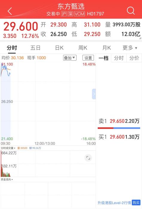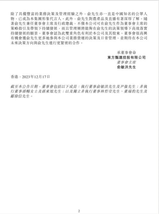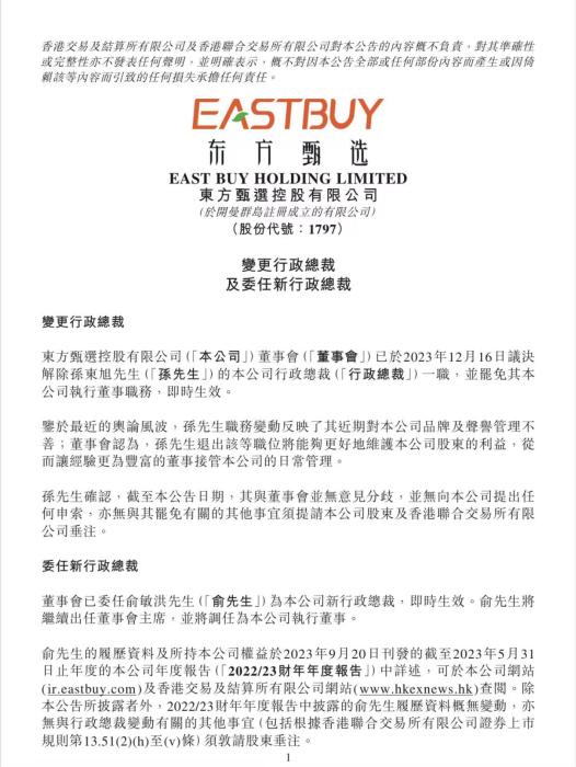 中新網(wǎng)12月18日電 12月18日,東方甄選開盤后股價大漲,截至發(fā)稿時,漲超10%。當日凌晨,東方甄選微博賬號發(fā)布的直播預告海報顯示,董宇輝的身份已成為“東方甄選高級合伙人”。12月17日,東方甄選發(fā)布公告稱,董事會已于12月16日議決解除孫東旭的行政總裁一職,并罷免其公司執(zhí)行董事職務,即時生效。(中新財經(jīng))