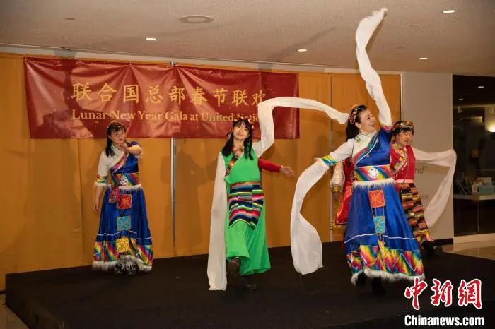 資料圖:當(dāng)?shù)貢r間1月20日,聯(lián)合國中國書會舞蹈團在紐約聯(lián)合國總部舉辦的春節(jié)聯(lián)歡晚會上表演《格桑拉》。中新社記者 廖攀 攝