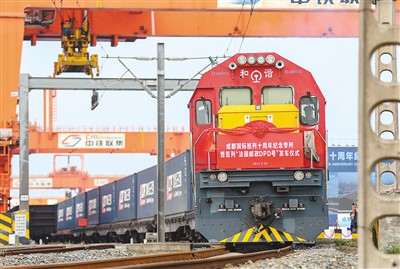 4月26日,成都國際班列十周年紀(jì)念專列暨首列“法國郵政DPD號”發(fā)車儀式在成都國際鐵路港舉行。