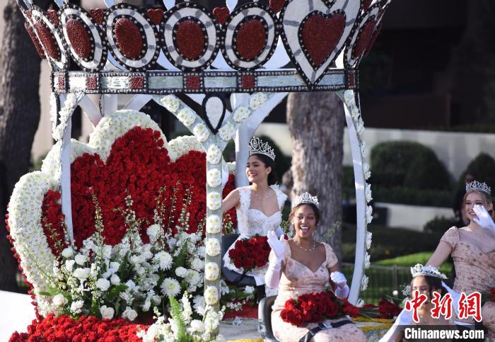 當?shù)貢r間1月1日上午,第135屆美國玫瑰花車游行在加利福尼亞州歷史文化名城帕薩迪納市舉行。圖為2024年度“玫瑰皇后和玫瑰公主”花車?!≈行律缬浾?張朔 攝