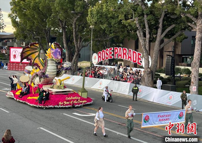 當?shù)貢r間1月1日上午,第135屆美國玫瑰花車游行在加利福尼亞州歷史文化名城帕薩迪納市舉行。圖為南加州阿罕布拉市帶來的“慶祝龍年”主題花車?!≈行律缬浾?張朔 攝