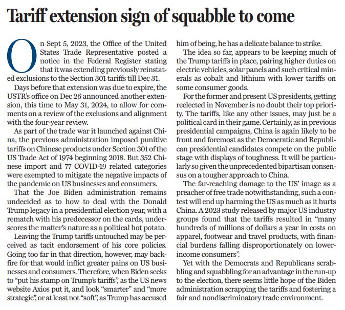 美國貿(mào)易代表辦公室近期宣布,進(jìn)一步延長對(duì)352項(xiàng)已恢復(fù)豁免的中國進(jìn)口商品和77種與新冠防疫相關(guān)的中國商品的301條款關(guān)稅豁免期,期限由2023年12月31日延至2024年5月31日。