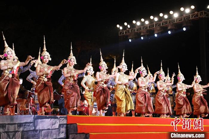 1月13日晚,“中柬人文交流年”啟動儀式在柬埔寨暹粒舉行。圖為柬埔寨舞蹈藝術(shù)家表演傳統(tǒng)舞蹈。 中新社發(fā) 黎海月 攝