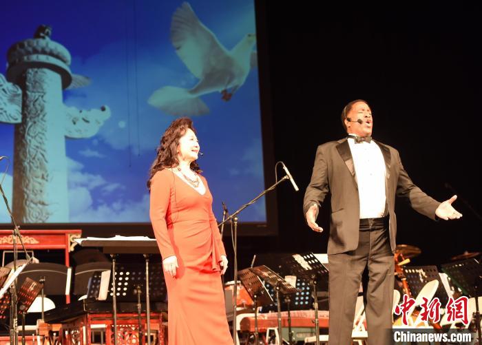 當(dāng)?shù)貢r間1月27日晚,以紀(jì)念中美建交45周年為主題的鷹飛龍騰新年音樂會在美國洛杉磯唱響。圖為中美兩國歌唱家聯(lián)袂演唱《我愛你中國》?!≈行律缬浾?張朔 攝