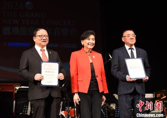 當(dāng)?shù)貢r間1月27日晚,以紀(jì)念中美建交45周年為主題的鷹飛龍騰新年音樂會在美國洛杉磯唱響。圖為美國聯(lián)邦眾議員趙美心(中)向美國鷹龍傳媒董事長蘇彥韜(左)等主辦方代表頒發(fā)賀狀?!≈行律缬浾?張朔 攝