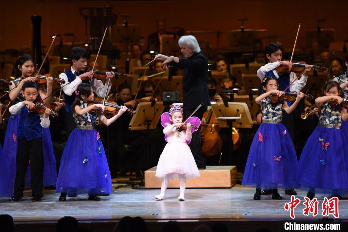 當(dāng)?shù)貢r間2月10日晚,美國太平洋交響樂團(tuán)與橙郡音樂與舞蹈藝術(shù)中心的孩子們合作演奏小提琴協(xié)奏曲《梁?!贰!≈行律缬浾? 張朔 攝