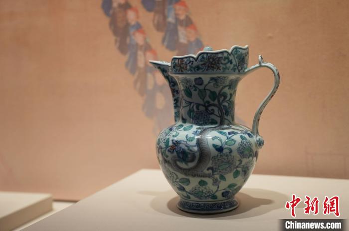 2月27日,正在“御瓷歸來”展覽上展出的“清乾隆時期斗彩螭龍穿花紋僧帽壺”?!⑺紓?攝