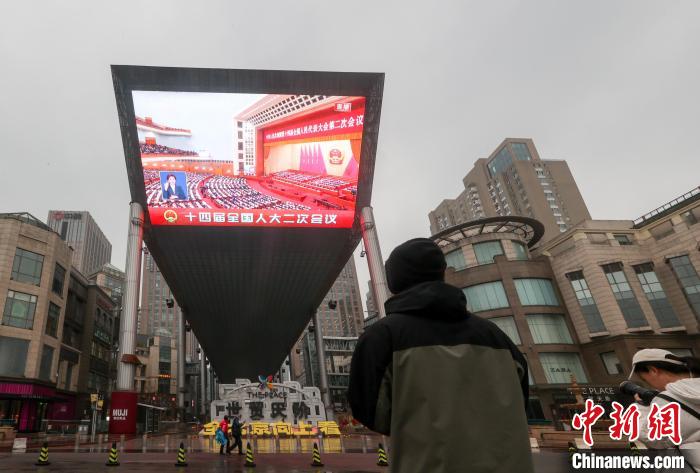3月5日,十四屆全國人大二次會議在北京人民大會堂開幕。圖為北京一戶外大屏播放開幕會?!≈行律缬浾?賈天勇 攝