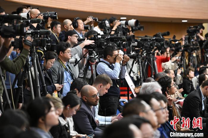 3月6日,十四屆全國人大二次會議在北京舉行記者會,國家發(fā)展和改革委員會主任鄭柵潔、財政部部長藍佛安、商務部部長王文濤、中國人民銀行行長潘功勝、中國證券監(jiān)督管理委員會主席吳清就發(fā)展改革、財政預算、商務、金融證券等相關問題回答中外記者提問。圖為中外記者在現(xiàn)場采訪?!≈行律缬浾?何蓬磊 攝