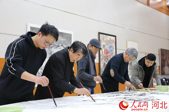 人民網(wǎng)石家莊1月6日電 由“為奧運(yùn)喝彩”組委會主辦的“百名畫家繪冬奧”活動5日走進(jìn)河北。河北省20余名當(dāng)?shù)厮囆g(shù)家現(xiàn)場揮毫潑墨,合作創(chuàng)作了三幅奧林匹克題材的中國畫作,喜迎即將到來的冰雪盛會。