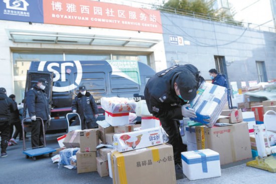 昨天上午,海淀區(qū)上地街道博雅西園社區(qū)門(mén)口,工作人員在幫社區(qū)居民轉(zhuǎn)運(yùn)快遞。本報(bào)記者 王海欣攝