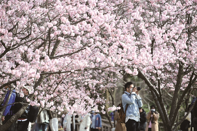 南京中山植物園北園的櫻花大道,一眼望去,好似被粉色云彩包裹住,如夢(mèng)如畫。圖為7日,不少市民游客在櫻花樹下打卡拍照。