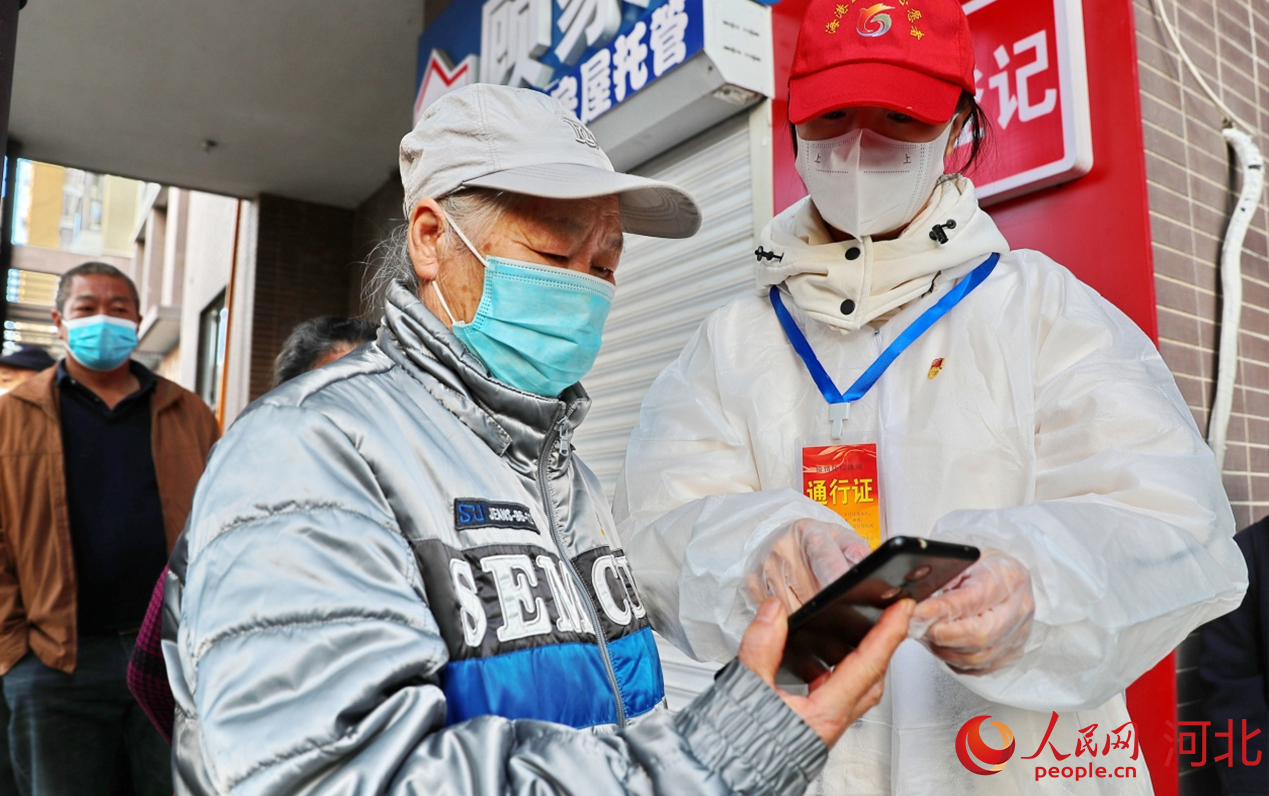 人民網(wǎng)石家莊3月27日電 “打開電子健康碼。”“保持好1米距離?!薄?月25日上午9點(diǎn),在河北秦皇島市海港區(qū)森林逸城小區(qū),秦皇島市委組織部黨員先鋒隊(duì)隊(duì)員董菁正在組織居民有序排隊(duì)做核酸檢測,提醒大家準(zhǔn)備好電子健康碼,耐心指導(dǎo)不熟悉操作流程的居民。