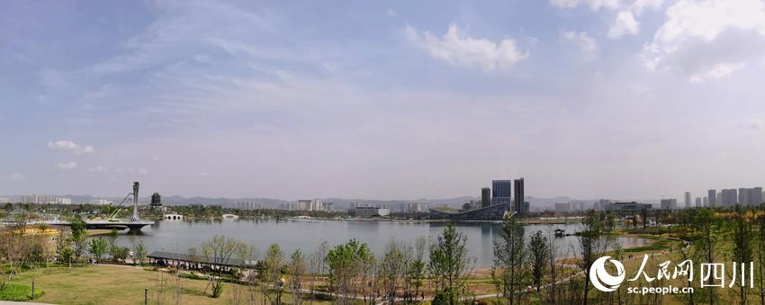龍泉山脈綿亙遠方,東安湖水蕩漾眼底,體育場館巍峨半空,花草樹木各展春姿。在湖光山色之間,有大量市民前來踏青賞春,順便欣賞著大運會場館和火炬塔的風采。