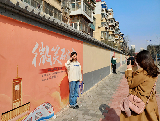 市民在“微笑墻”打卡拍照。 石家莊網(wǎng)信辦供圖