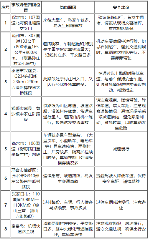 預(yù)計有可能出現(xiàn)大流量的路段:京港澳保定段、大廣衡水段、首都環(huán)線、黃石、青銀石太段和京昆西柏坡段等。