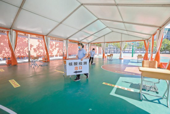 用紅色遮陽棚搭建在操場上的室外休息區(qū),下午考試結(jié)束后將變身核酸檢測區(qū)。 本報記者 潘之望攝