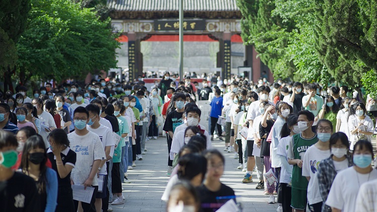 晉城一中考點(diǎn)外,考生等待入場。張偉攝