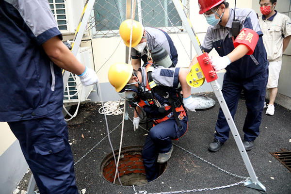 此次演練分為前期準(zhǔn)備、有限空間規(guī)范作業(yè)及作業(yè)人員遇險科學(xué)施救流程演示三個部分。首先,參演人員依次展示了作業(yè)審批、安全交底、工具檢查、現(xiàn)場安全檢查、封閉作業(yè)區(qū)域并設(shè)置警示標(biāo)志等作業(yè)前期準(zhǔn)備工作。隨后,對有限空間出入口的有毒有害氣體、氧氣濃度進(jìn)行檢測并進(jìn)行自然通風(fēng)或使用機(jī)械設(shè)備進(jìn)行強(qiáng)制通風(fēng),待監(jiān)測評估符合作業(yè)要求后,架設(shè)救援用三腳架,參演人員穿戴好有限空間作業(yè)器具并經(jīng)檢查合格后,在持續(xù)通風(fēng)并有人員進(jìn)行安全監(jiān)護(hù)的條件下,下井作業(yè)。最后,為避免因有限空間作業(yè)發(fā)生事故后盲目施救而產(chǎn)生連鎖事故,由救援人員展示如何正確穿戴呼吸器等救援防護(hù)用品并確保自身安全的前提下下井救援,利用三腳架等設(shè)備將受困人員安全救出并脫離危險場所的同時呼叫救援,進(jìn)行心肺復(fù)蘇等規(guī)范施救流程。