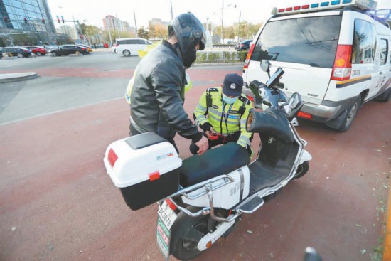 菜市口路口,西城區(qū)交通支隊(duì)民警對私自改裝電動(dòng)自行車的違法行為進(jìn)行查處。本報(bào)記者 甘南攝(資料片)