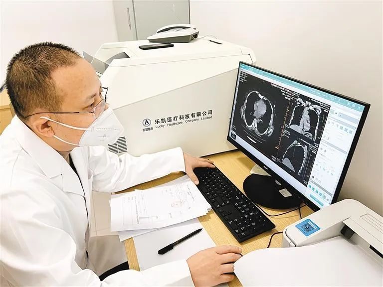 10日上午,在杜城社區(qū)衛(wèi)生服務(wù)中心診室門前,等候拍片的患者不多。在工作人員引導(dǎo)下,大家有序進(jìn)入拍攝區(qū)。診室內(nèi),陜西省康復(fù)醫(yī)院影像一科主任高雅鵬正在一個看似與普通顯示器沒什么兩樣的電腦前書寫診斷報告?!氨绕鹨话愕腃T靜態(tài)閱片,在這臺顯示器的幫助下,我們可以實(shí)現(xiàn)多角度、多方位、動態(tài)式閱片,讓診斷更加細(xì)致精準(zhǔn)?!?高雅鵬說,這臺CT機(jī)的配置完全可以滿足周邊居民對于肺部CT的拍片需求。