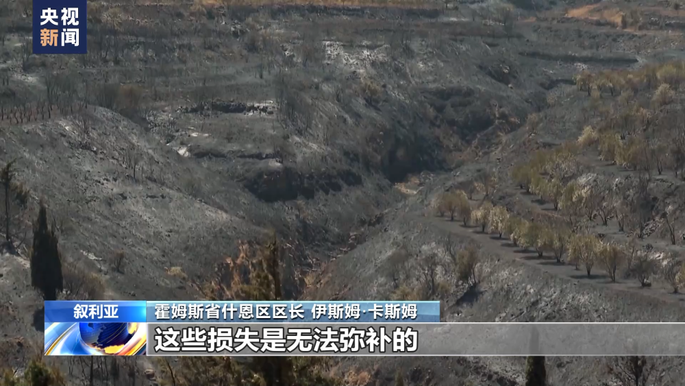 霍姆斯省什恩區(qū)區(qū)長 伊斯姆·卡斯姆:大火蔓延了約430平方公里,這里種植了橄欖、蘋果、葡萄、無花果樹等,損失非常巨大。我們可以看到橄欖樹都被燒焦了,果農(nóng)損失了大概20年的橄欖產(chǎn)量,這個地區(qū)往年能產(chǎn)出約1.6萬升的橄欖油,約1.6萬升的蘋果醋,還有蘋果都能出口到鄰國。今年我們將面臨橄欖油和蘋果產(chǎn)量降低,這些損失是無法彌補的。