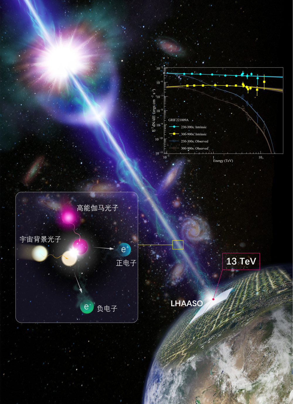 國家重大科技基礎(chǔ)設(shè)施“高海拔宇宙線觀測站(LHAASO)”(簡稱“拉索”)正式發(fā)布了迄今最亮的伽馬射線暴(簡稱“伽馬暴”,編號GRB 221009A)的高能伽馬輻射的精確能譜,該結(jié)果挑戰(zhàn)了傳統(tǒng)的伽馬暴余輝的標準輻射模型,揭示出宇宙背景光在紅外波段強度低于預期。同時,該能譜為檢驗愛因斯坦相對論的適用范圍、探索暗物質(zhì)候選粒子——軸子等新物理研究方面提供了重要信息。相關(guān)結(jié)果于北京時間11月16日在《科學進展》(Science Advances)上發(fā)表,由中國科學院高能物理研究所牽頭的拉索國際合作組完成。