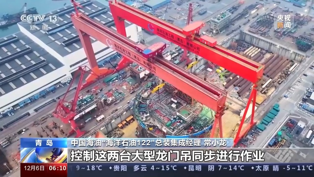 總臺(tái)央視記者 張叢婧:這里是青島海洋工程高新裝備制造基地,隨著現(xiàn)場(chǎng)最后一個(gè)模塊吊裝就位,意味著經(jīng)過(guò)20個(gè)月的施工,這個(gè)集原油生產(chǎn)、存儲(chǔ)、外輸?shù)裙δ苡谝惑w的新型“海上油氣加工廠”主體結(jié)構(gòu)建造完工,進(jìn)入集成調(diào)試階段。