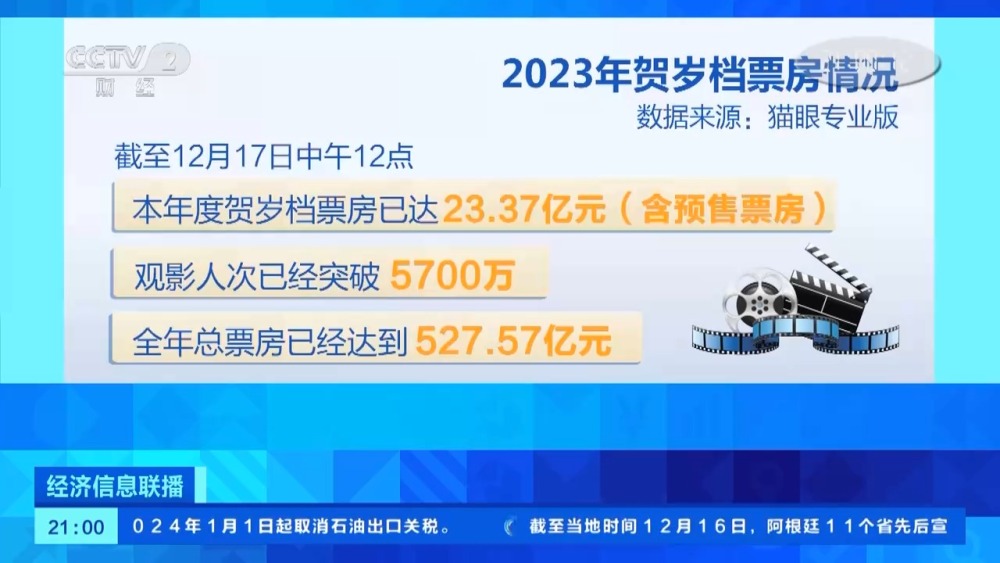 某電影數(shù)據(jù)平臺(tái)顯示,截至12月17日中午12點(diǎn),本年度賀歲檔票房已達(dá)23.37億元(含預(yù)售票房),觀影人次已經(jīng)突破5700萬,全年總票房已經(jīng)達(dá)到527.57億元。