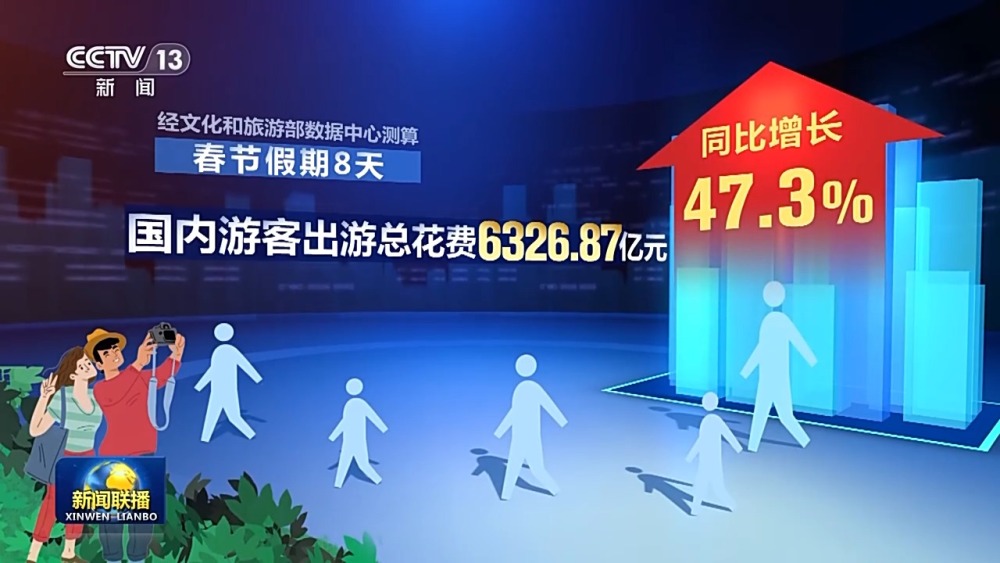 今年這個春節(jié),人們走得更遠(yuǎn),游玩時間更長。出行平臺分析訂單數(shù)據(jù)后發(fā)現(xiàn),假期里,超過一半的人選擇跨省出游,其中三成以上的人選擇兩個及以上目的地,中國游客出境目的地覆蓋全球1700多個城市,個性化出游、定制化消費成為新趨勢。在陜西景區(qū)里看一場沉浸式演出,游客既是觀眾,又是演員,全新消費體驗帶來上億元演出收入;四川把火鍋文化和特色觀光結(jié)合在一起,帶動特色餐飲消費熱度不斷。節(jié)日里,滕王閣景區(qū)北園向公眾開放,通過濱江水道,游客可以直接穿行老城區(qū)的商鋪。經(jīng)文化和旅游部數(shù)據(jù)中心測算,春節(jié)假期八天,全國國內(nèi)旅游出游4.74億人次,同比增長34.3%,國內(nèi)游客出游總花費6326.87億元,同比增長47.3%。