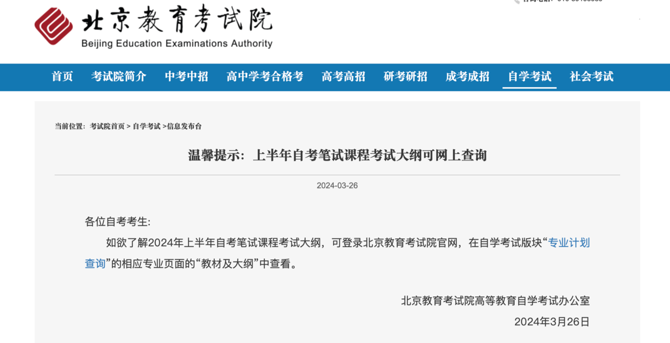 央廣網(wǎng)北京3月27日消息(記者 吳佳怡)據(jù)悉,2024年上半年自考筆試課程考試大綱可網(wǎng)上查詢。考生可登錄北京教育考試院官網(wǎng),在自學(xué)考試版塊“專業(yè)計(jì)劃查詢”的相應(yīng)專業(yè)頁面的“教材及大綱”中查看。