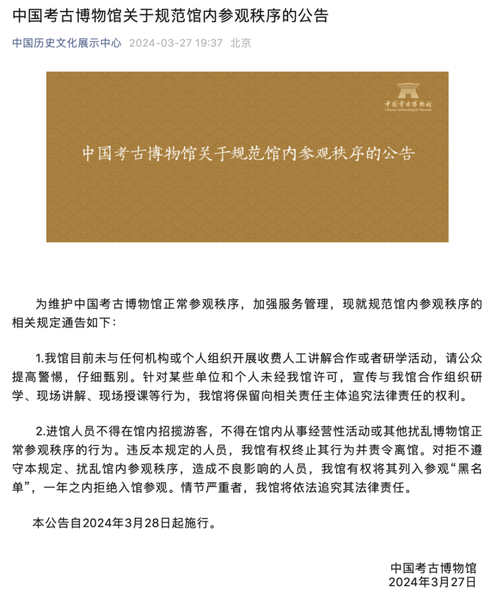 3月27日,中國考古博物館發(fā)布關于規(guī)范館內(nèi)參觀秩序的公告。