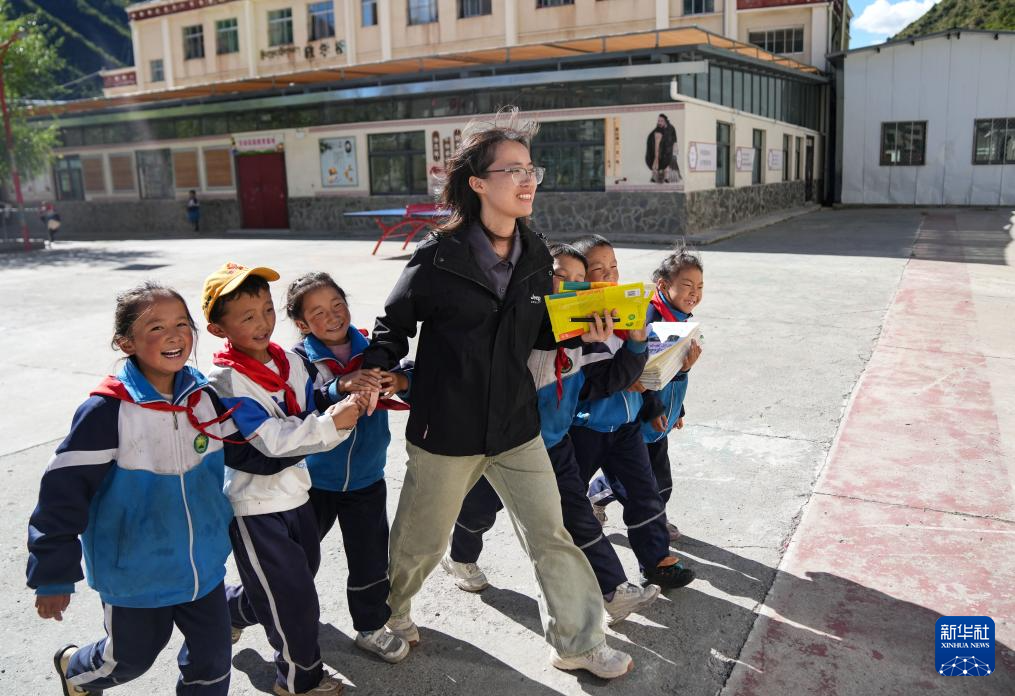 涂建枝與孩子們一路同行(9月3日攝)。新華社記者 晉美多吉 攝