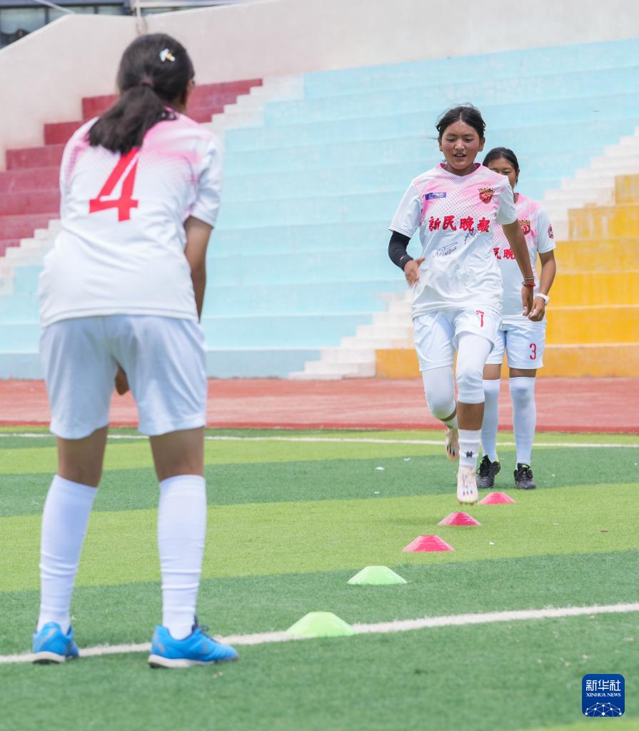 在西藏日喀則市上海實(shí)驗(yàn)學(xué)校,“珠峰雪鷹”女子足球隊(duì)隊(duì)員們在操場上訓(xùn)練(9月3日攝)。