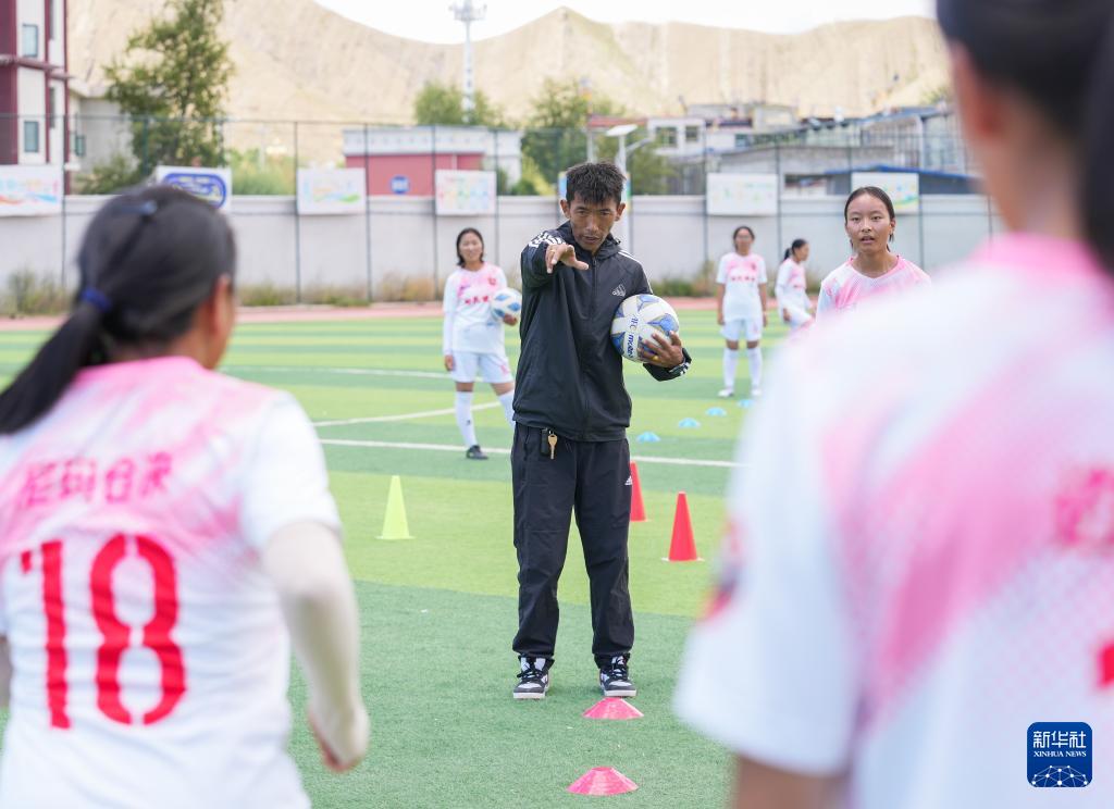 西藏日喀則市上海實(shí)驗(yàn)學(xué)?!爸榉逖棥迸幼闱蜿?duì)教練洛布桑在操場上指導(dǎo)球員訓(xùn)練(9月3日攝)。