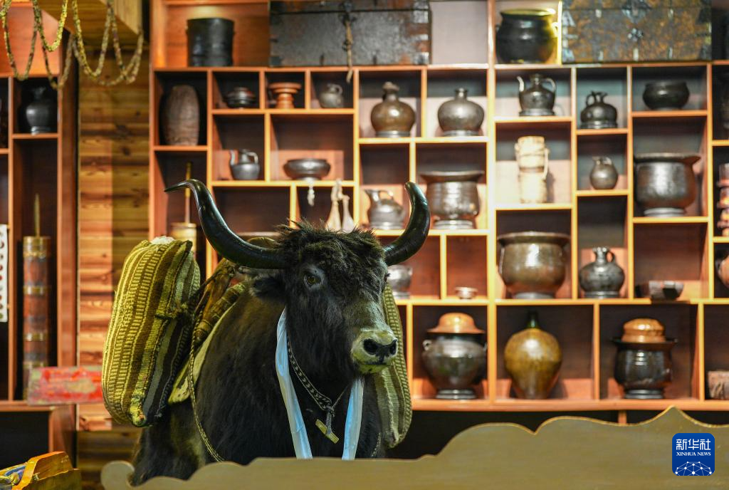 茶館主人珠珠將藏式茶館與民俗陳列方式相結(jié)合,讓顧客在品嘗美食的同時,沉浸式體驗民俗文化。茶館四周和過道上擺滿700余種3000多件西藏民俗物件,有給牛犢喂奶的牛角奶瓶、火柴盒大小的便攜酥油盒、防沙塵和雪盲的牦牛毛墨鏡等。牧民生產(chǎn)生活用具幾乎都能在這里找到,獨具風格的茶館儼然成為一座藏北游牧文化“博物館”。