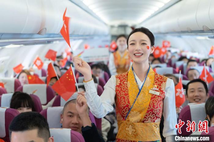 2月19日,西藏航空“拉薩-成都天府-香港”航線開通。圖為航班上舉行首航慶祝儀式。 西藏航空供圖