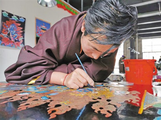 圖為唐卡漆畫(huà)技藝培訓(xùn)班學(xué)員正在繪制唐卡。 鄭曉強(qiáng)、周婷婷 攝