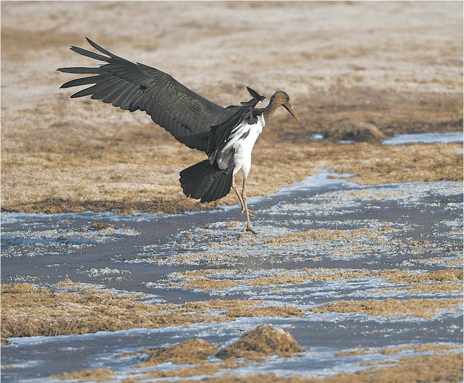 12月6日,一只黑鸛在西寧市北川河濕地公園內(nèi)嬉戲。近日,位于青海省西寧市的北川河濕地公園迎來兩只黑鸛。黑鸛屬鸛形目、鸛科,國家一級保護(hù)動物,目前全世界僅存3000只左右,屬于國寶級珍禽。新華社記者吳剛攝
