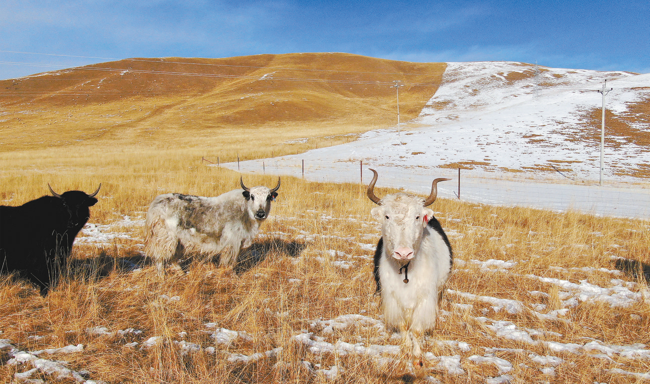 幾頭牦牛在雪后的草原上活動。