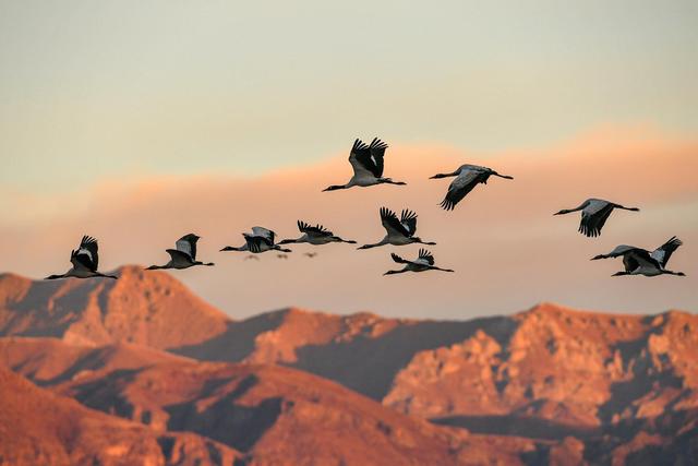 黑頸鶴在拉薩市林周縣黑頸鶴自然保護(hù)區(qū)上空飛翔(2019年1月1日攝)。新華社記者 張汝鋒 攝