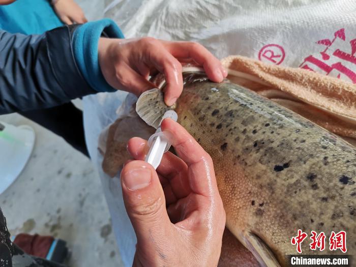 圖為多布水電站增殖放流站工作人員為魚(yú)進(jìn)行人工催產(chǎn)。