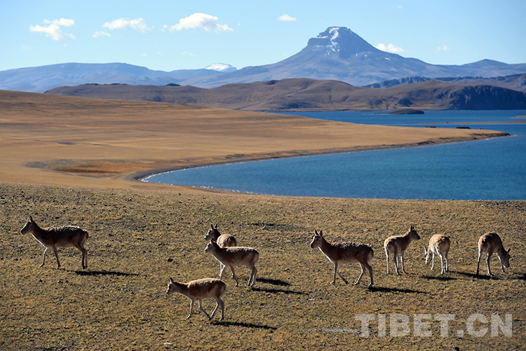 湖濱河畔,地勢平坦開闊,水草豐盛甜美,是藏羚羊頻繁活動的場所。藏羚羊是一種善跑的動物,跑起來輕快灑脫、疾如長風(fēng),時速可達80公里。