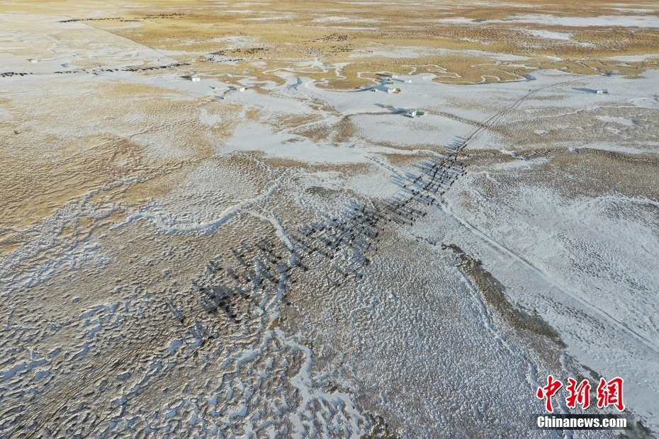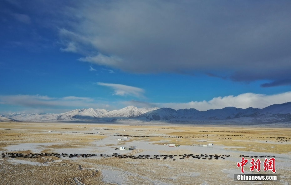 1月27日,當(dāng)雄縣龍仁鄉(xiāng)烏達(dá)村牧民趕著牛羊去牧場。當(dāng)雄縣位于西藏自治區(qū)拉薩市北部,距拉薩市區(qū)170公里?!爱?dāng)雄”,藏語意為“天選牧場”,平均海拔約4200米,草場廣闊,土地肥沃。(無人機(jī)照片) 中新社記者 貢嘎來松 攝