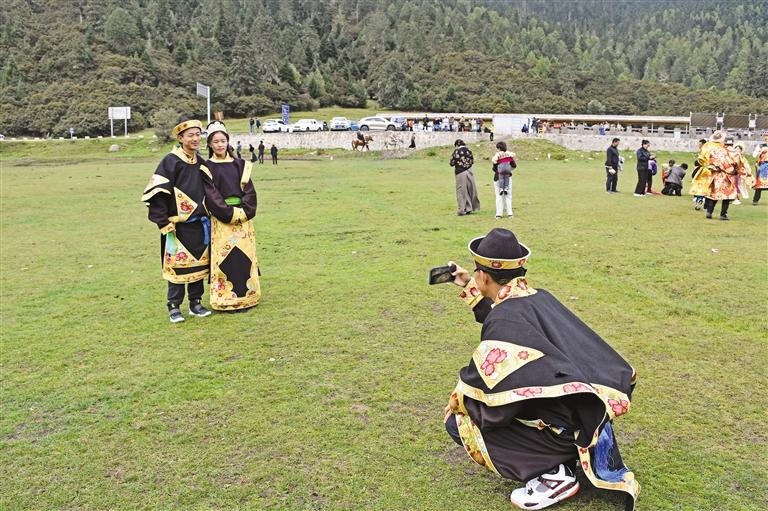 圖為來自廣東的游客身著工布服飾拍照留念。 記者 胡文 攝