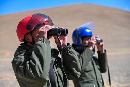 洛桑日達(dá)(左)與隊(duì)友正在觀(guān)察野生動(dòng)物。新華社記者周荻瀟 攝